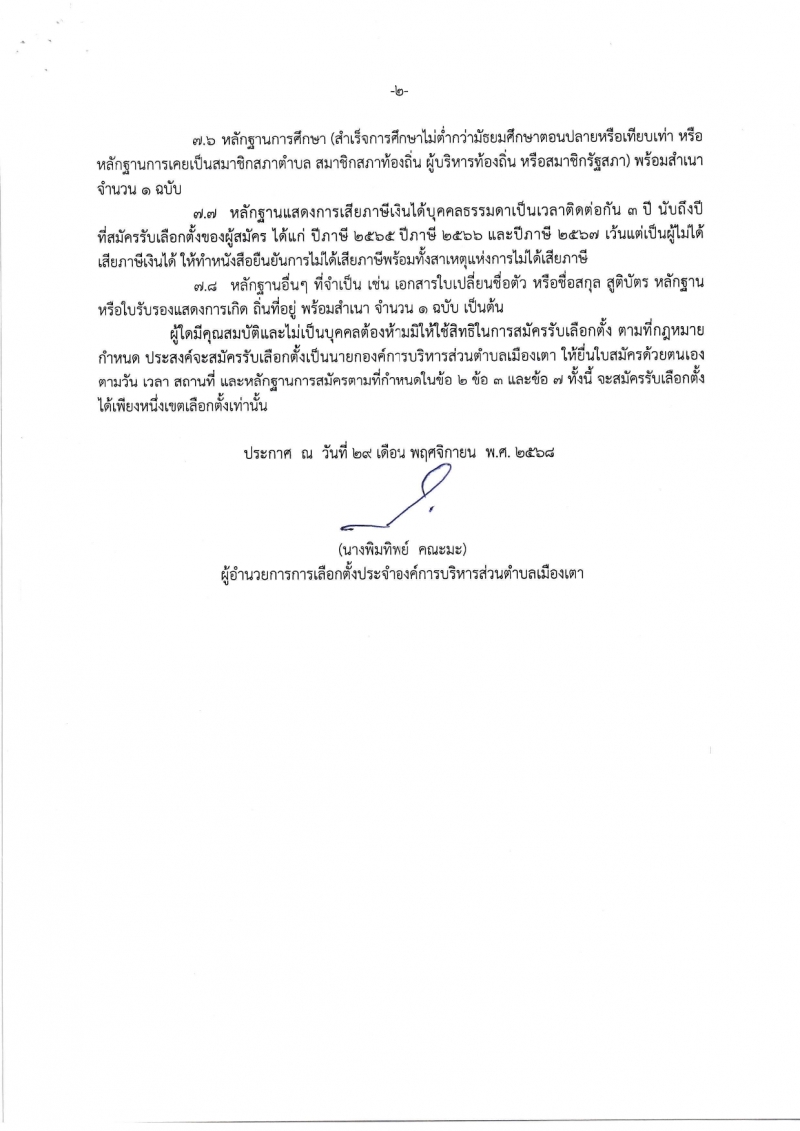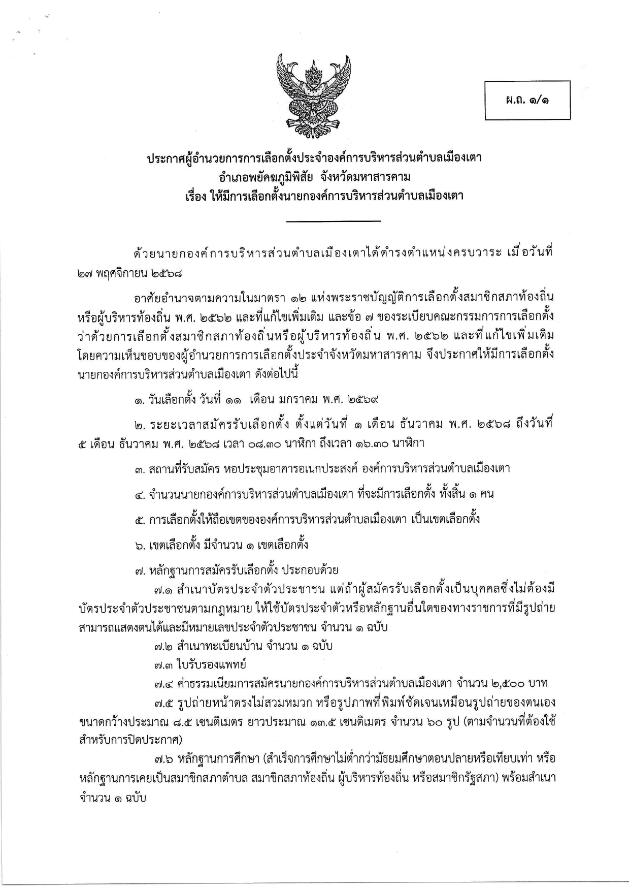 ประกาศผู้อำนวยการการเลือกตั้งประจำองค์การบริหารส่วนตำบลเมืองเตา อำเภอพยัคฆภูมิพิสัย จังหวัดมหาสารคาม เรื่องให้มีการเลือกตั้งนายกองค์การบริหารส่วนตำบลเมืองเตา