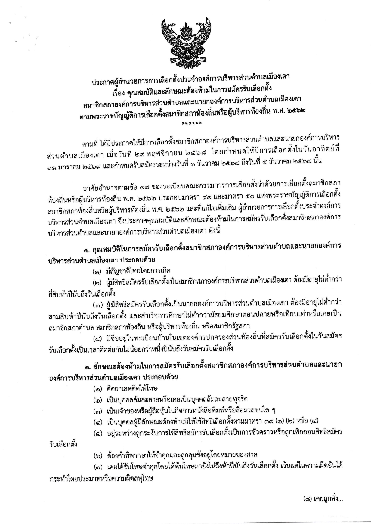 ประกาศผู้อำนวยการการเลือกตั้งประจำองค์การบริหารส่วนตำบลเมืองเตา เรื่องคุณสมบัติและลักษณะต้องห้ามในการรับสมัครเลือกตั้งสมาชิกสภาองค์การบริหารส่วนตำบลและนายกองค์การบริหารส่วนตำบลเมืองเตา ตามพระราชบัญญัติการเลือกตั้งสมาชิกสภาท้องถิ่นหรือผู้บริหารท้องถิ่นพ.ศ. 2562