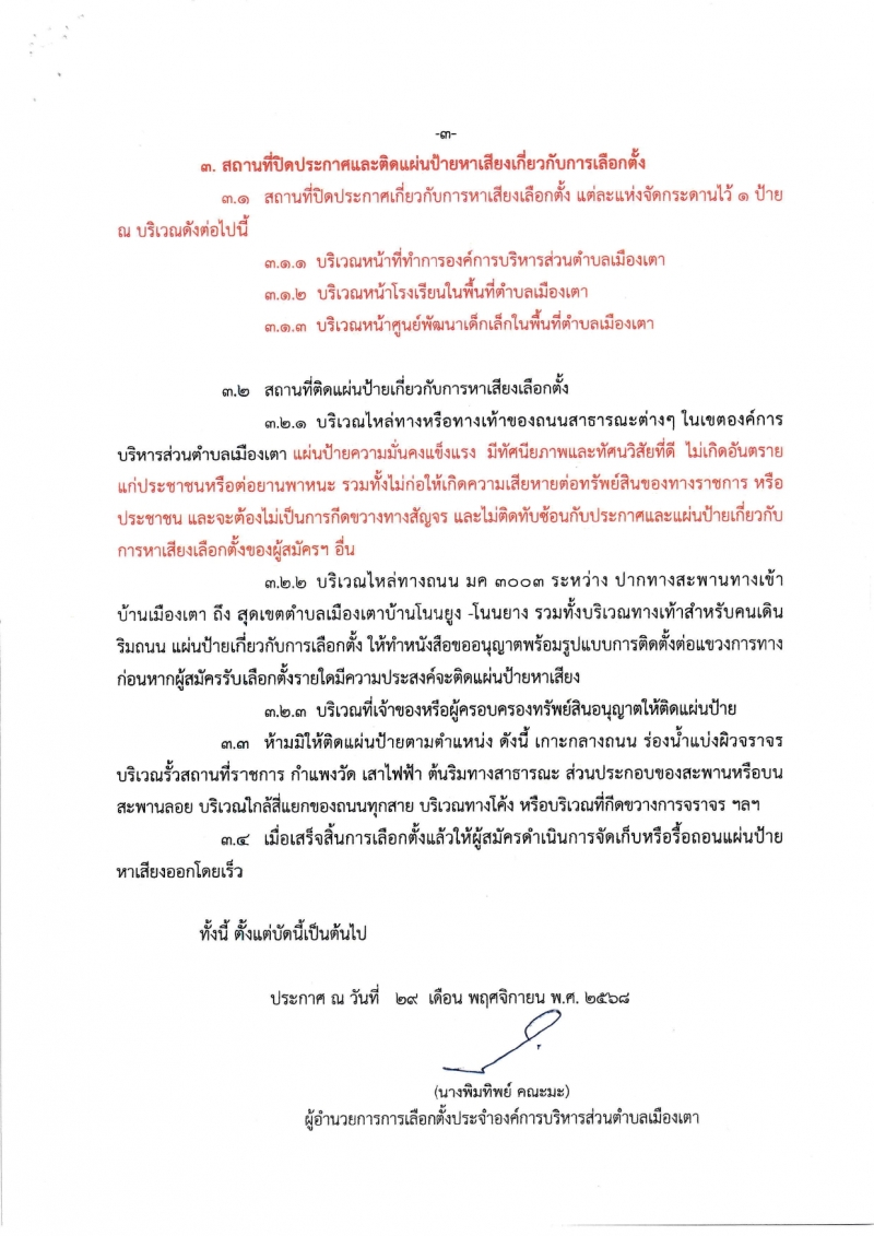ประกาศคณะกรรมการการเลือกตั้งประจำองค์การบริหารส่วนตำบลเมืองเตา เรื่องกำหนดสถานที่หลักเกณฑ์และวิธีการปิดประกาศและติดแผ่นป้ายเกี่ยวกับการหาเสียงเลือกตั้งของผู้สมัครรับเลือกตั้งเป็นสมาชิกสภาองค์การบริหารส่วนตำบลเมืองเตาและนายกองค์การบริหารส่วนตำบลเมืองเตา