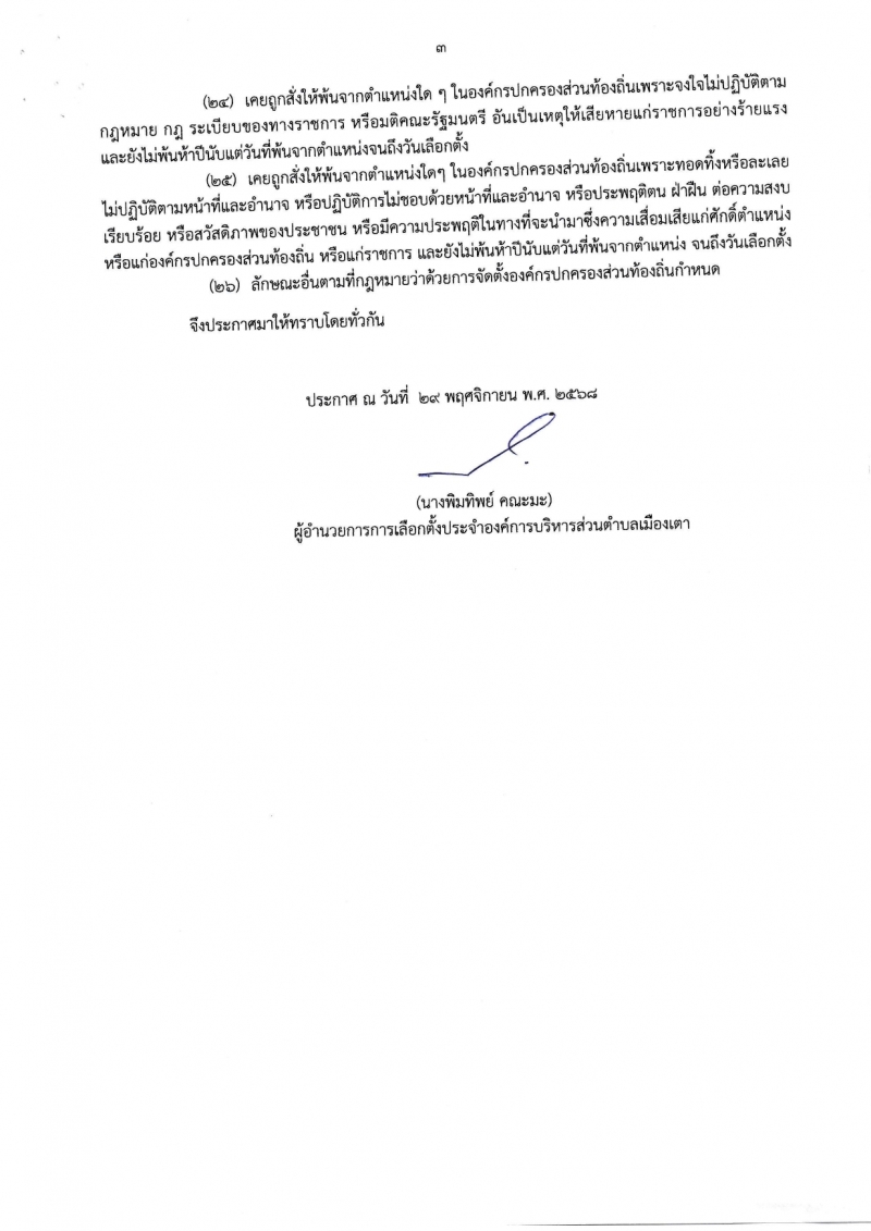 ประกาศผู้อำนวยการการเลือกตั้งประจำองค์การบริหารส่วนตำบลเมืองเตา เรื่องคุณสมบัติและลักษณะต้องห้ามในการรับสมัครเลือกตั้งสมาชิกสภาองค์การบริหารส่วนตำบลและนายกองค์การบริหารส่วนตำบลเมืองเตา ตามพระราชบัญญัติการเลือกตั้งสมาชิกสภาท้องถิ่นหรือผู้บริหารท้องถิ่นพ.ศ. 2562