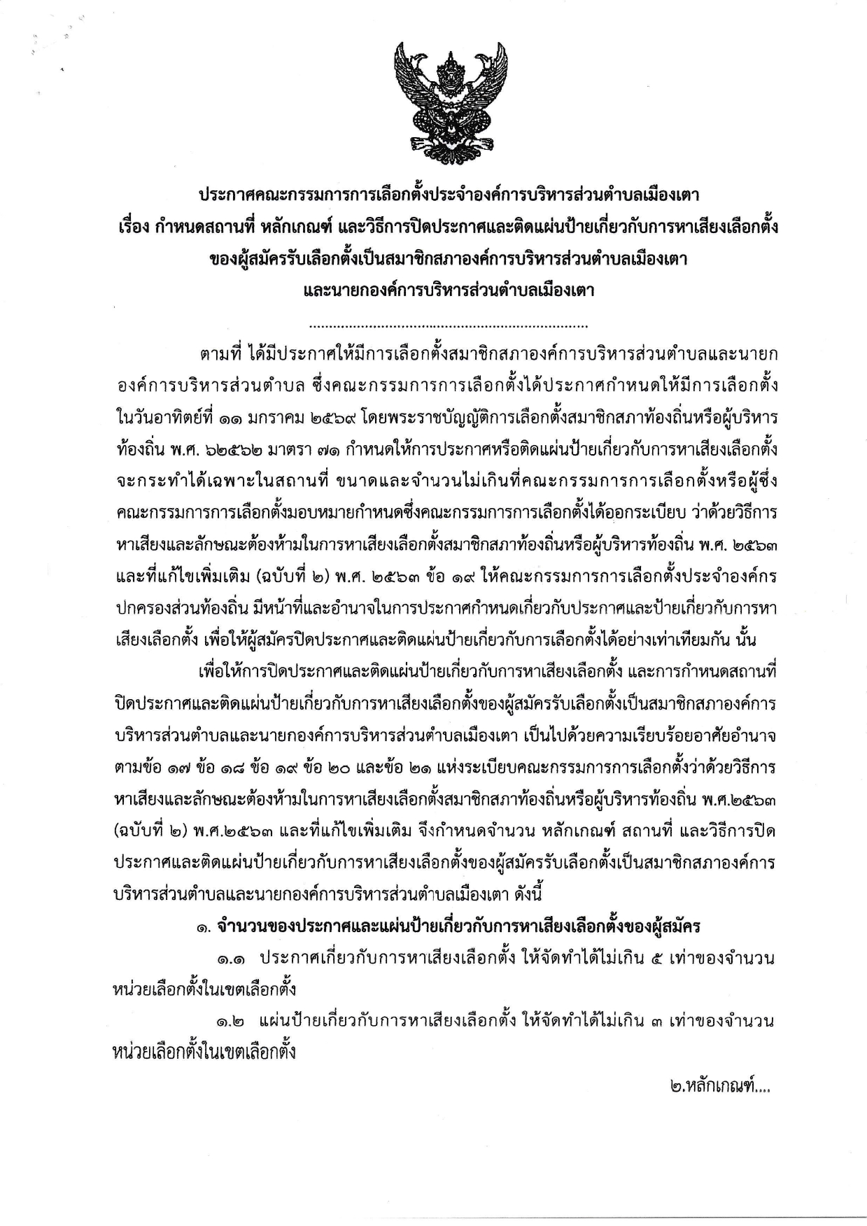 ประกาศคณะกรรมการการเลือกตั้งประจำองค์การบริหารส่วนตำบลเมืองเตา เรื่องกำหนดสถานที่หลักเกณฑ์และวิธีการปิดประกาศและติดแผ่นป้ายเกี่ยวกับการหาเสียงเลือกตั้งของผู้สมัครรับเลือกตั้งเป็นสมาชิกสภาองค์การบริหารส่วนตำบลเมืองเตาและนายกองค์การบริหารส่วนตำบลเมืองเตา