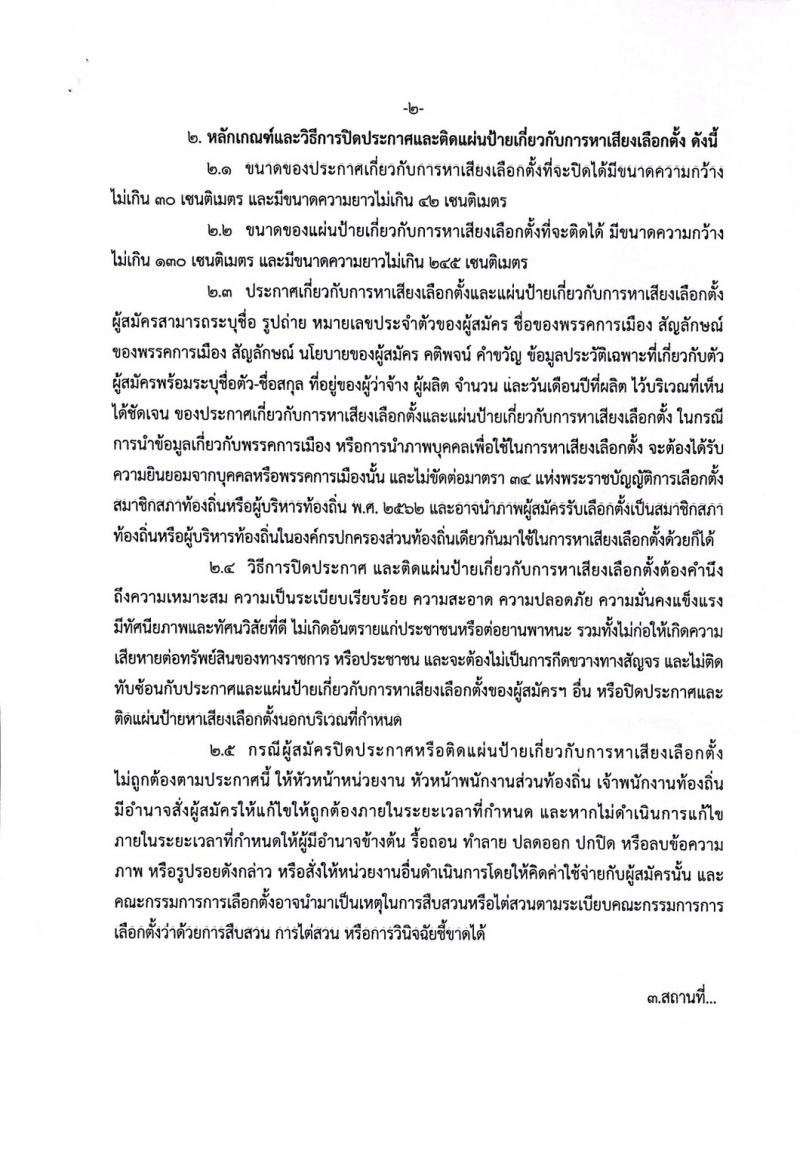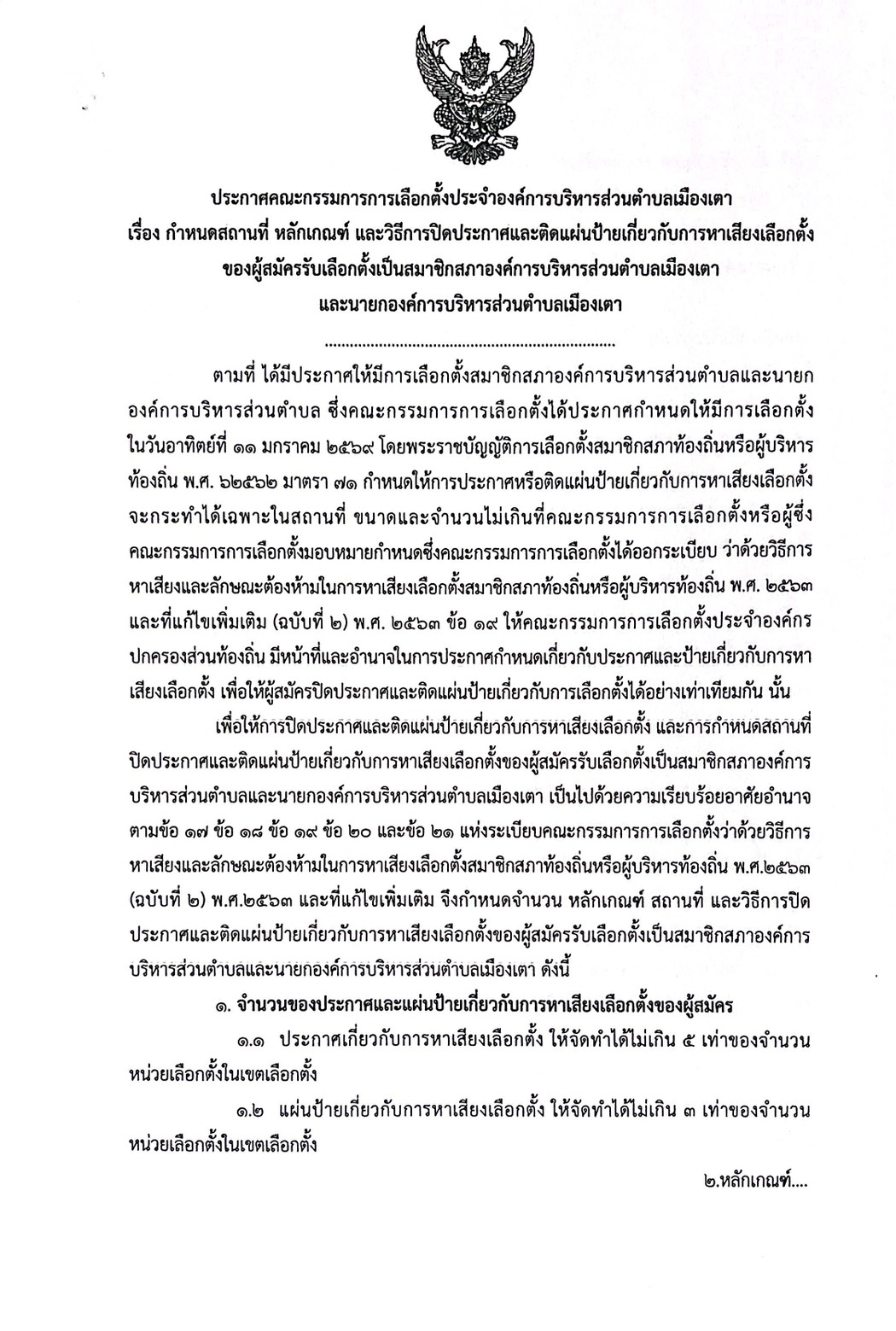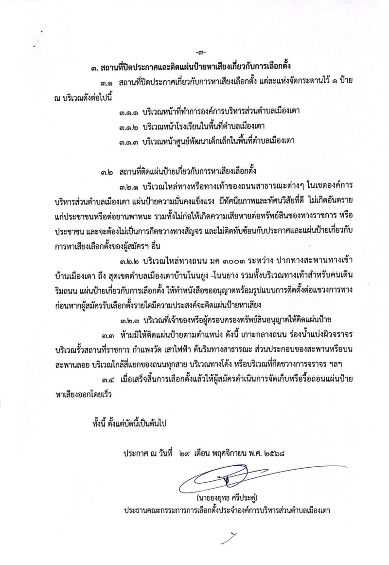 ประกาศ เรื่องกำหนดสถานที่ หลักเกณฑ์ และวิธีการปิดประกาศและติดแผ่นป้ายเกี่ยวกับการหาเสียงเลือกตั้ง ของผู้สมัครรับเลือกตั้งเป็นสมาชิกสภาองค์การบริหารส่วนตำบลเมืองเตาและนายกองค์การบริหารส่วนตำบลเมืองเตา